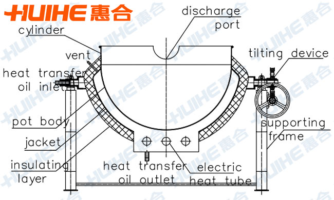 Tilting Jacketed Kettle is mainly composed of pot and tilting frame; and the pot is the double layer structure formed by inside and outside spherical pot; middle layer can add heat-conducting oil or water.