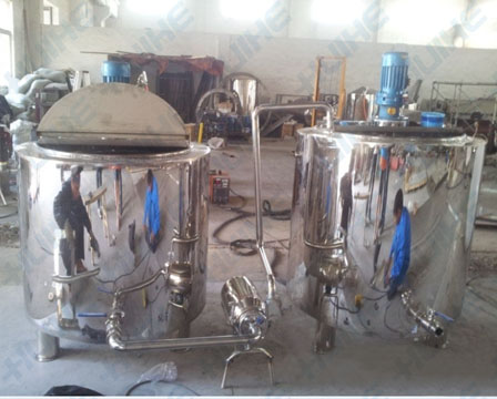 6)在以上各工序完成前,將定量的巴氏殺菌奶泵入配料罐中。 攪拌狀態(tài)下將CMC溶液和糖液泵入配料罐,并充分混合均勻保證料液溫度≤10℃,(用配料用水頂管道和冷板中殘留糖液時,應考慮調(diào)酸用水及定容用水的量)。