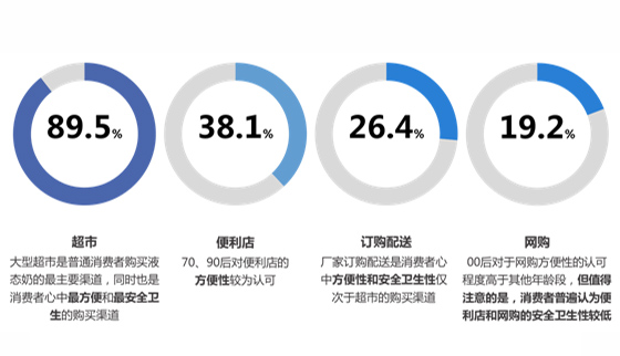 接近九成的消費者會選擇從超市購買液態(tài)奶,其次是便利店(38.1%)和訂購配送(26.4%),網(wǎng)購的比例更低,只有不到兩成。在消費者心中,超市也是“更方便”和“更安全衛(wèi)生”的購買渠道,其次是廠家訂購配送的渠道,僅有18.2%和13.7%的被訪消費者認(rèn)為便利店和網(wǎng)購是“更方便”和“更安全衛(wèi)生”的購買渠道。