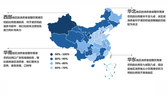 從地區(qū)上看,華北地區(qū)(除北京和天津兩個直轄市外)整體比例較低,西部地區(qū)比例很高,另外長江流域省份也相對較高。一線城市消費者對于液態(tài)奶健康方面的需求相對更加看重;二、三線城市以及其他中小城市則更加關(guān)注液態(tài)奶的味道、美容減肥效果、滿足小孩喜好等,且更易受身邊朋友的影響。
